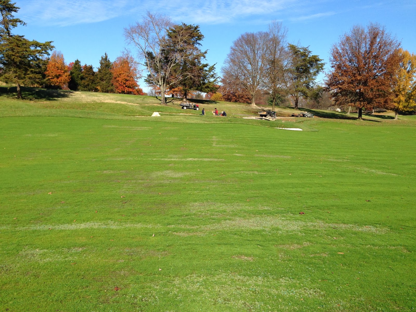 The recent ice and snow storms have left plenty of work for our crew. Tree branches galore as well as an abundance of leaves (and we thought we were done) are keeping the crew busy. The new turf continues to pose challenges with leaf removal. We have stopped allowing equipment on the turf as much as possible so much of the work is done by hand. Herbicides were applied to the newly seeded rough to remove germinating annual bluegrass and was quite successful. Some of the rough was dinged up a bit afterward by equipment driving over it during leaf removal but will improve rapidly in the spring.